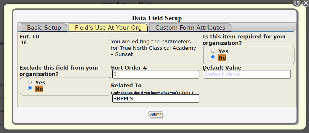 - Exclude this field from your organization? If it is a deafault system question (i.e. address, state) that you would rather not be displayed, you can set this to true and it will remove the question.