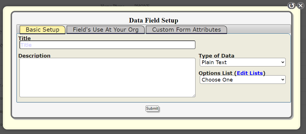- Type of Data: This drop down allows you to select what type of data this (i.e. text, paragraph, telephone number, date, etc.