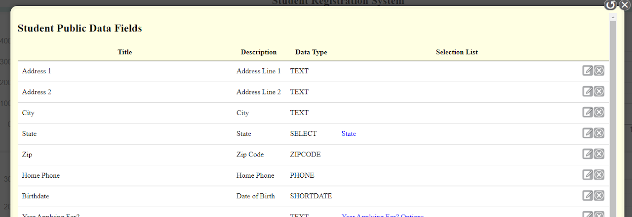 The image to the right shows the menu buttons that you can use to list the current data fields and start to edit or add additional data fields. The first three buttons are for the general (public) data fields that parents will have access to. The second group of three are the internal fields that parents do not have access to.