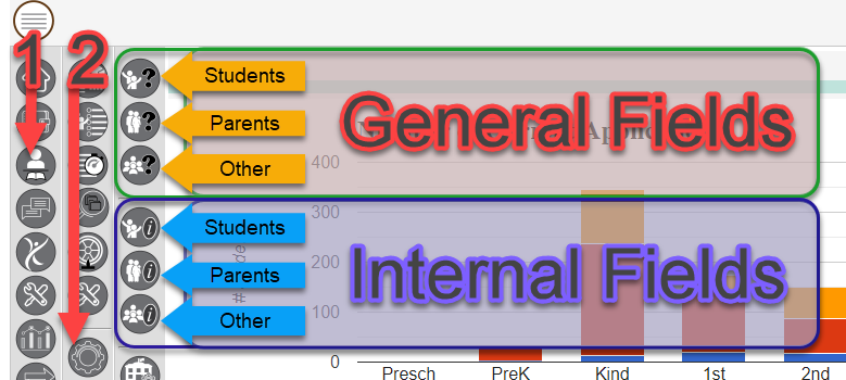 CharterAce's student registration system allows you to set up multiple types of data fields to manage information about people in the system. There are three different types of people in the system: Students, Parents, and Other. Each of those types of people have unique sets of data fields that can be set up. In addition, you can set up general data fields or internal data fields. General data fields are fields that the parents will see when they register their students. The internal data fields will not be visible by parents, and is used to keep track of information internally at the school.