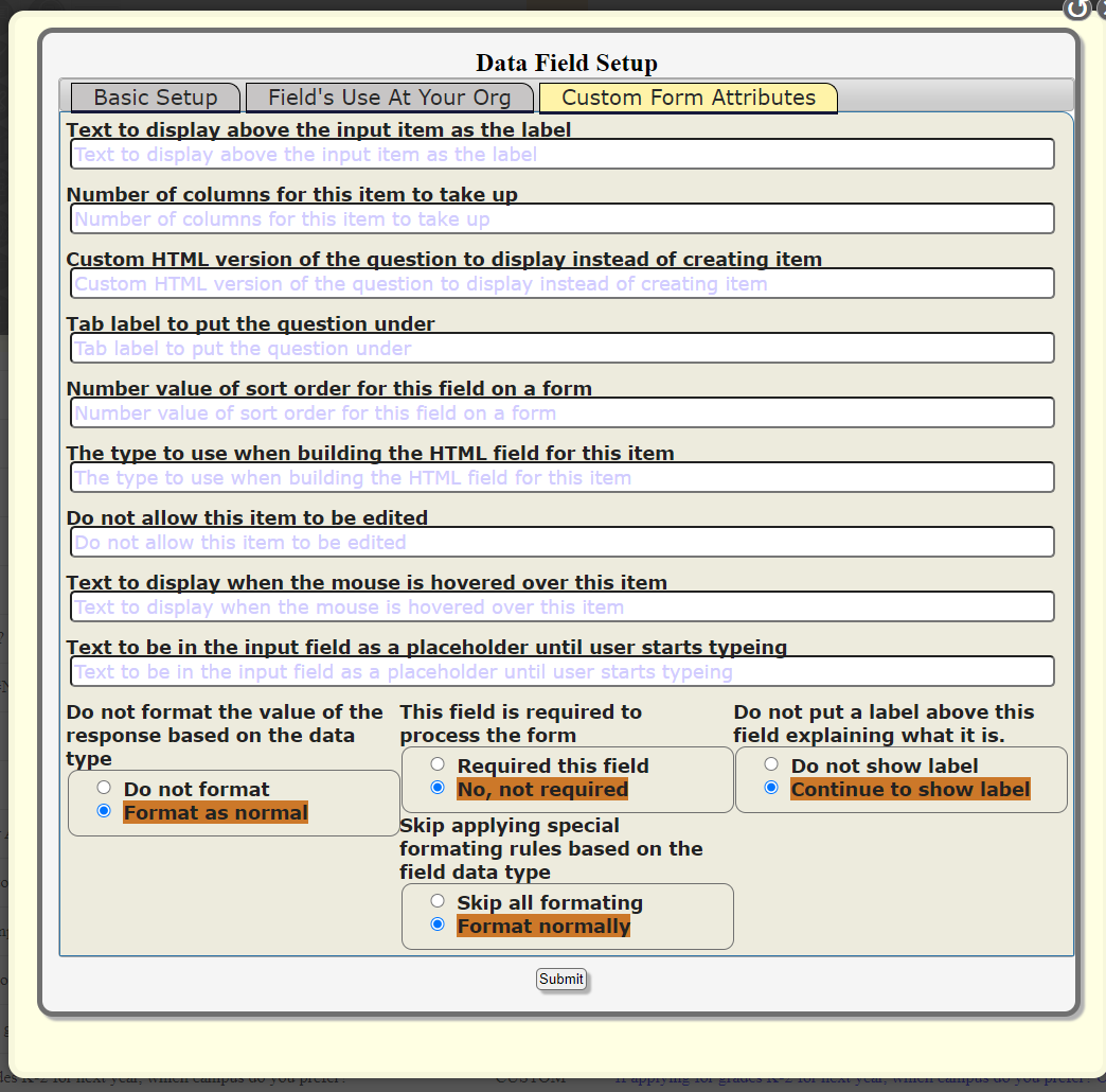 - Sort Order #: If you want to manually change the order of this item as it is listed with other data fields (Note it is easier to use the Sort Questions options from the question list than to use this option).