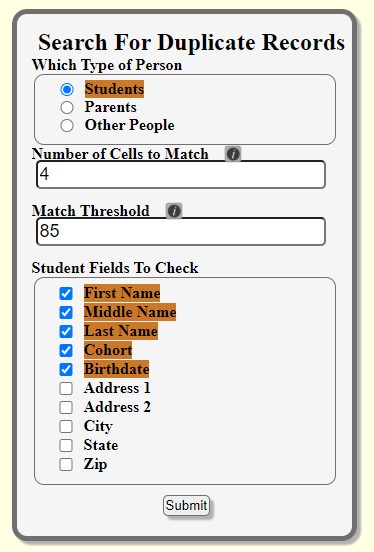 When you first open the Merge Students Tool, you will receive a form asking whether you want to check for students, parents or other people for duplicates. The next two fields identify how close the matches need to be. First, you need to identify how many fields need to match, and then the second is how close of a match (as a percentage of 100) you want them to be in order to be identified as potential matches. Then you select which fields you want to check. So the image to the left means that it will check five different fields (first, middle and last names, the cohort and birthdate). If 4 of those 5 fields are 85% the same, it will flag the two people as a potential match.