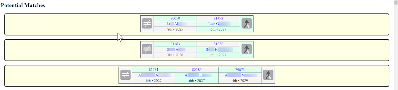 You will then receive a list of the potential matches from the system. It will list each student who meets the criteria you indicated on the previous form. Next to each pair you will find two buttons.