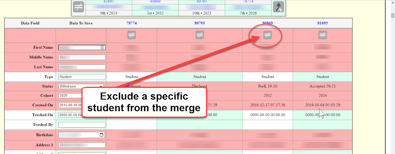 When you click the Show Merge options you will receive the details for each of the potential matches. You will see the first column identifies the data label, the second column is the data that will be kept as part of the merge, and each subsequent column are the data associated with each person. If you click on any piece of data, it will copy that data to the second column to keep the data as part of the merge. The rows that are highlighted in light red have data that do not match between the people, so those are the rows you should pay the closest attention to. You can also manually enter or change the data you want to keep.