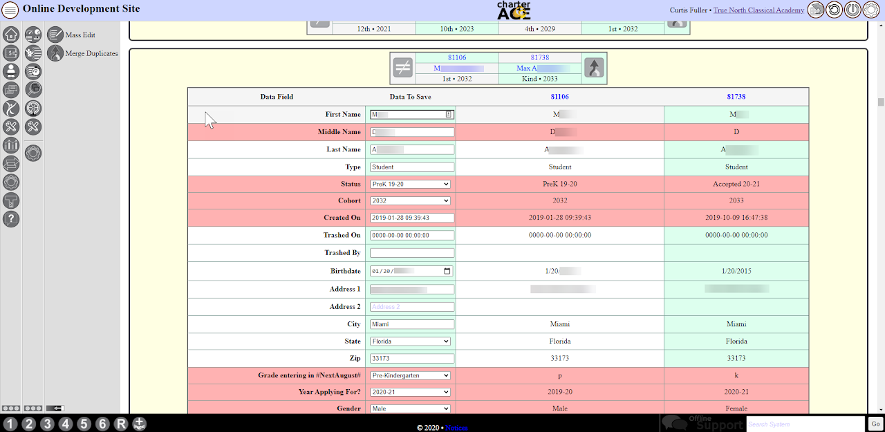 The Student Registration System has a tool built in that will help you find duplicate students and individuals and merge their accounts together. This is helpful if you have families who submit multiple applications for students hoping to circumvent the lottery by having additional applications in place. It is important to run this check before you do your lottery to ensure you have an accurate count of number of students who have applied to the school. You can access the tool by going to